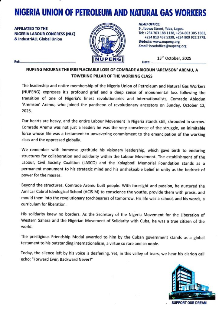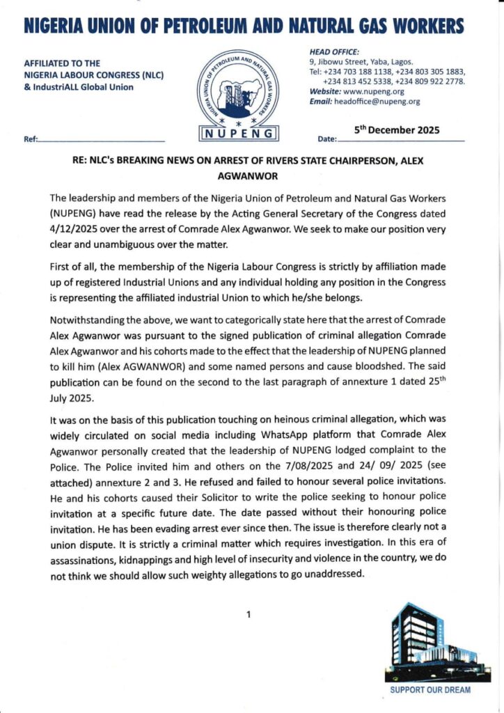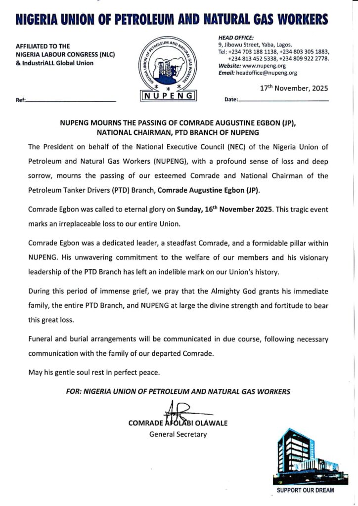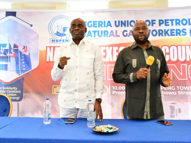 The NUPENG delegation included Comrade Afolabi Olawale (General Secretary), Comrade Otunba Salimon Akanni Oladiti (National Trustee), Comrade Mathias Ote (PTD National Chairman), Comrade Stanley Ominyi (Branch Chairman, NUPENG NMDPRA), Comrade Innocent Okafor (NMDPRA Abuja Unit Chairman), and Comrade Samuel Okougbodu (Assistant Branch Secretary).