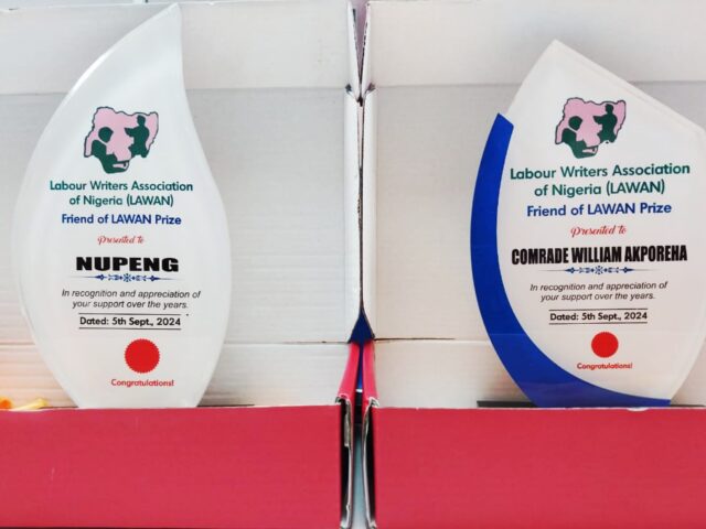 On Thursday, September 5, 2024, Comrade (Prince) Williams Akporeha and the Nigeria Union of Petroleum and Natural Gas Workers (NUPENG) were honored with the “Friend of LAWAN Prize” by the Labour Writers Association of Nigeria (LAWAN). This award recognizes their longstanding support for LAWAN.