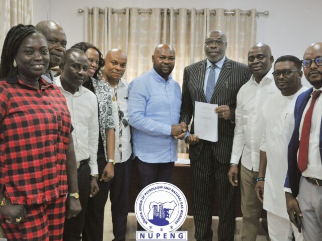 The leadership of the Nigeria Union of Petroleum and Natural Gas Workers (NUPENG) led by Comrade (Prince) Williams Akporeha, Comrade Afolabi Olawale, General Secretary, and Comrade Solomon Kilanko, Deputy President respectively, earlier today received in audience representatives of the Management of Nigeria Liquified Natural Gas (NLNG) led by Mr. Paul Bakare (Employee Industrial Relations Manager) and Mr. Jude Ozenua (Employee Industrial Relations) to the National Secretariat on a courtesy visit to the National Secretariat.