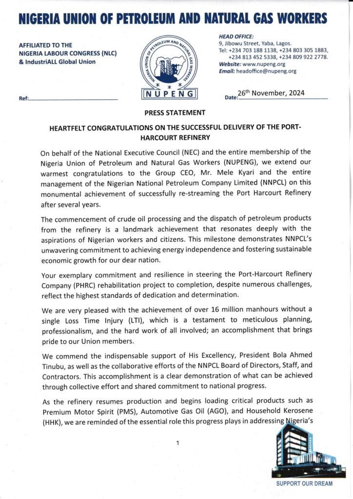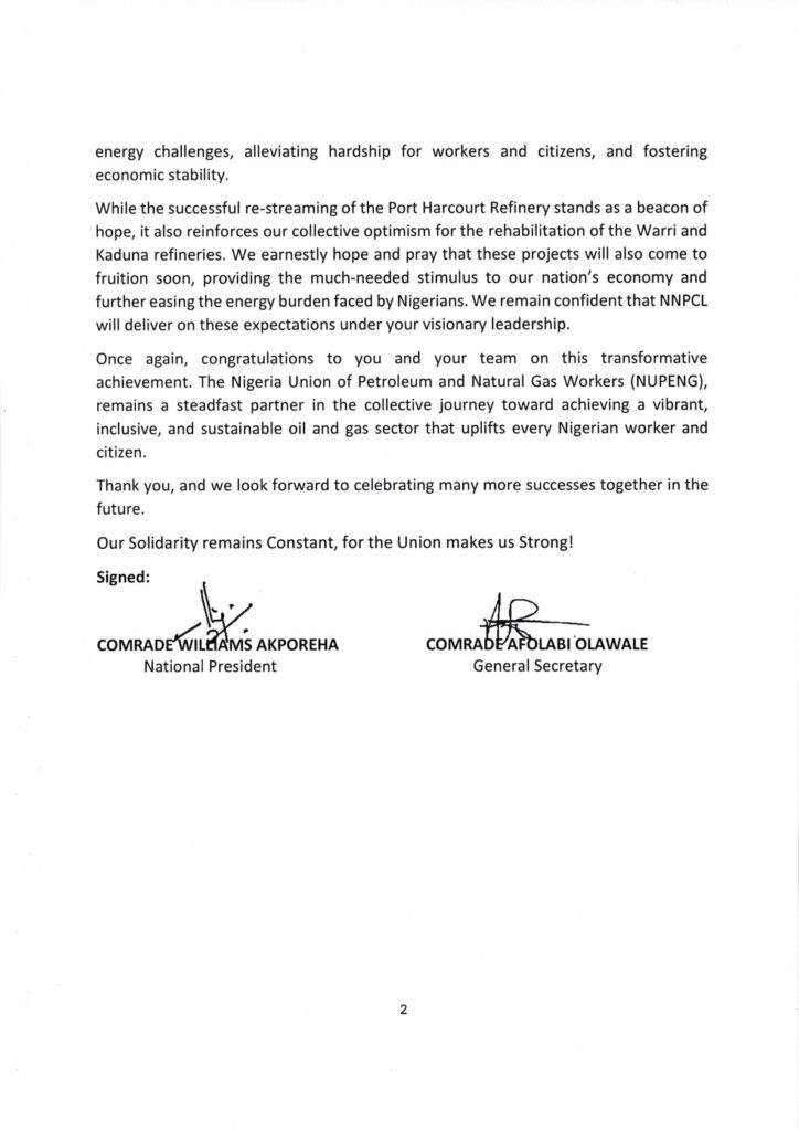 HEARTFELT CONGRATULATIONS ON THE SUCCESSFUL DELIVERY OF THE PORT-HARCOURT REFINERY