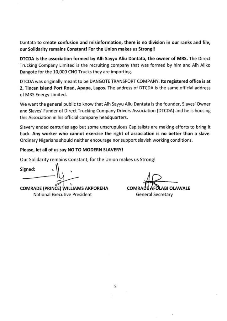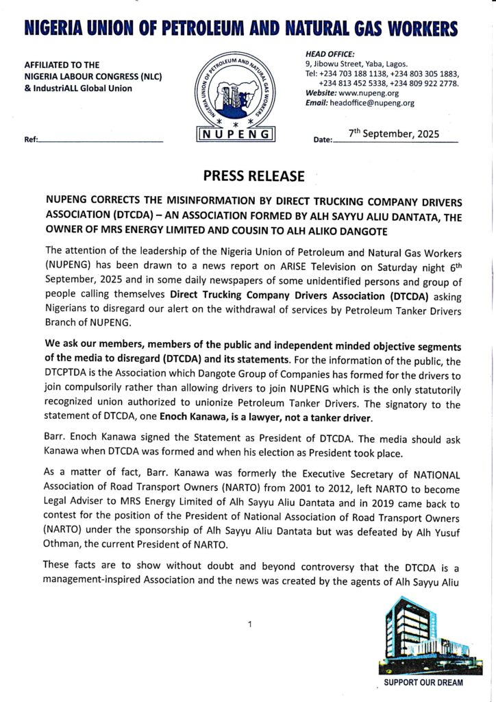 PRESS RELEASE – NUPENG CORRECTS THE MISINFORMATION BY DIRECT TRUCKING COMPANY DRIVERS ASSOCIATION (DTCDA) – AN ASSOCIATION FORMED BY ALH SAYYU ALIU DANTATA, THE OWNER OF MRS ENERGY LIMITED AND COUSIN TO ALH ALIKO DANGOTE