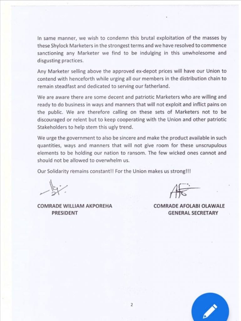 Any Marketer selling above the approved ex-depot prices will have our Union to contend with henceforth while urging all our members in the distribution chain to remain steadfast and dedicated to serving our fatherland.