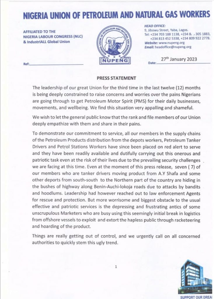 To demonstrate our commitment to service, all our members in the supply chains of the Petroleum Products distribution from the depots workers, Petroleum Tanker Drivers and Petrol Stations Workers have since been placed on red alert to serve and they have been readily available and dutifully carrying out this onerous and patriotic task even at the risk of their lives due to the prevailing security challenges we are facing at this time. Even at the moment of this press release, seven ( 7) of our members who are tanker drivers moving product from A.Y Shafa and some other deports from south-south to the Northern part of the country are hiding in the bushes of highway along Benin-Auchi-lokoja roads due to attacks by bandits and hoodlums. Leadership had however reached out to law enforcement Agents for rescue and protection. But more worrisome and biggest obstacle to the usual effective and patriotic services is the depressing and frustrating antics of some unscrupulous Marketers who are busy using this seemingly initial break in logistics from offshore vessels to exploit and extort the hapless public through racketeering and hoarding of the product.
