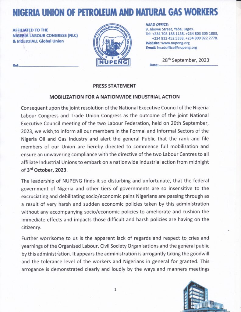 Consequent upon the joint resolution of the National Executive Council of the Nigeria Labour Congress and Trade Union Congress as the outcome of the joint National Executive Council meeting of the two Labour Federation, held on 26th September, 2023, we wish to inform all our members in the Formal and Informal Sectors of the Nigeria Oil and Gas Industry and alert the general Public that the rank and file members of our Union are hereby directed to commence full mobilization and ensure an unwavering compliance with the directive of the two Labour Centres to all affiliate Industrial Unions to embark on a nationwide industrial action from midnight of 3rd October, 2023.