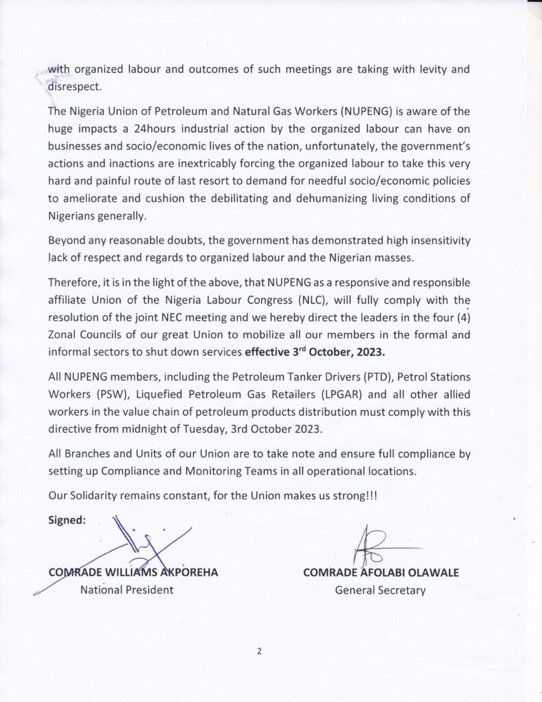All NUPENG members, including the Petroleum Tanker Drivers (PTD), Petrol Stations Workers (PSW), Liquefied Petroleum Gas Retailers (LPGAR) and all other allied workers in the value chain of petroleum products distribution must comply with this directive from midnight of Tuesday, 3rd October 2023.