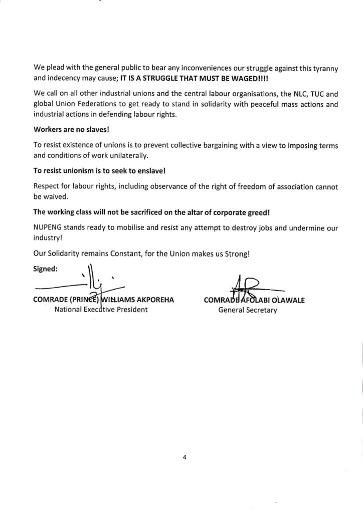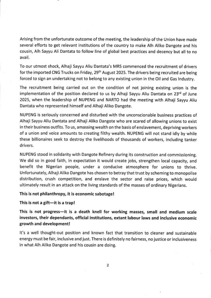 PRESS STATEMENT – NUPENG STANDS AGAINST ALIKO DANGOTE’S PRIMITIVE CAPITALIST MONOPOLISTIC AND ANTI UNION AGENDA AIMED AT RAISING PRICES AND ATTACKING LIVING STANDARDS OF THE MASSES ON THE LONG RUN